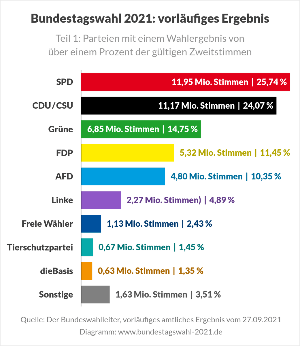 Nach vorläufigem Endergebnis landen die Genossen mit 257 Prozent knapp vor der Union 241. September findet in Deutschland die Bundestagswahl 2021 statt. Im einstelligen Bereich liegen die Linke mit 472 und sonstige Parteien mit 527.